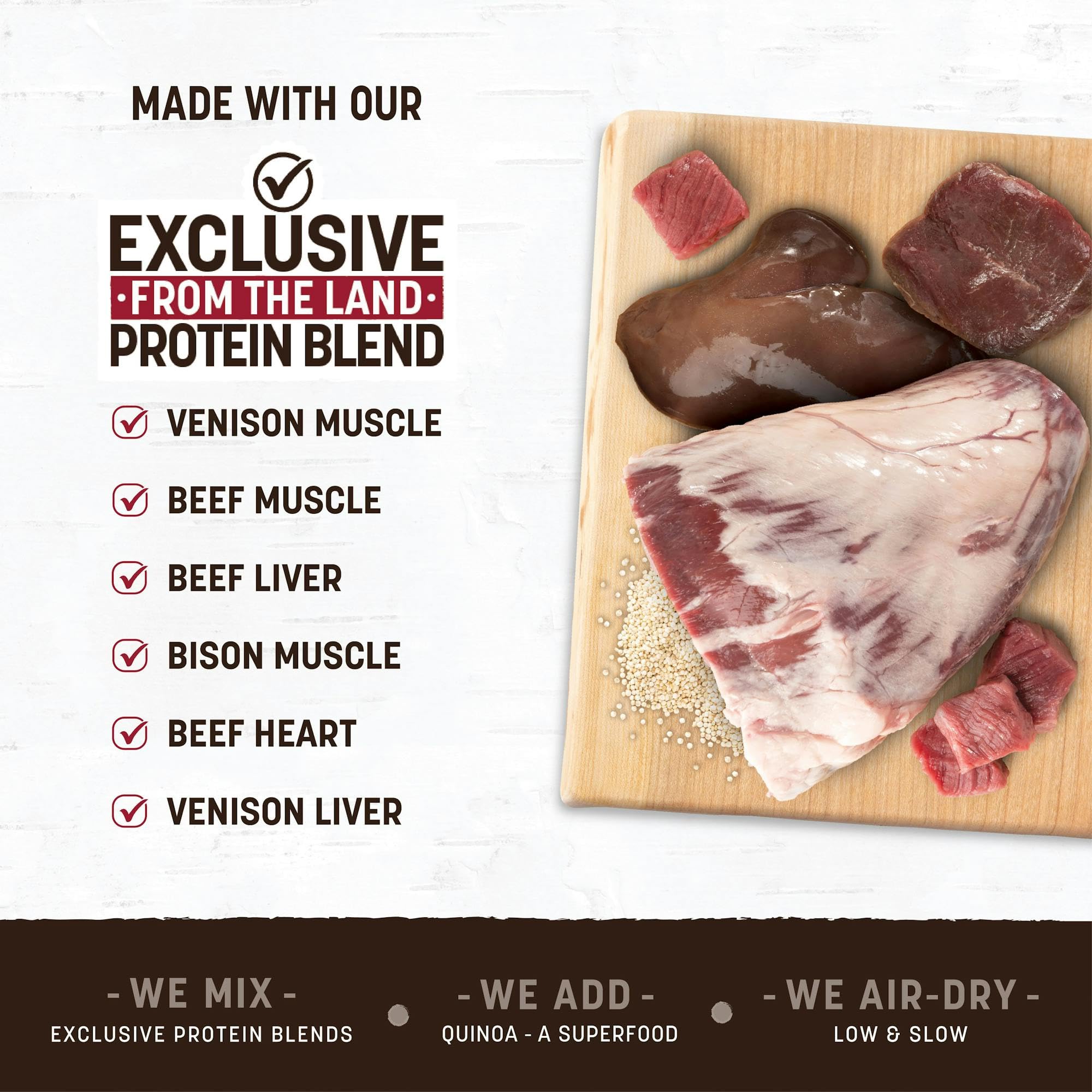 - UNIQUE, PREMIUM RECIPE: Made with our Exclusive Protein Blend of sustainably sourced venison, beef, beef liver, bison, beef heart, & venison liver to deliver superior nutrition & taste. Enriched with quinoa, an ancient grain