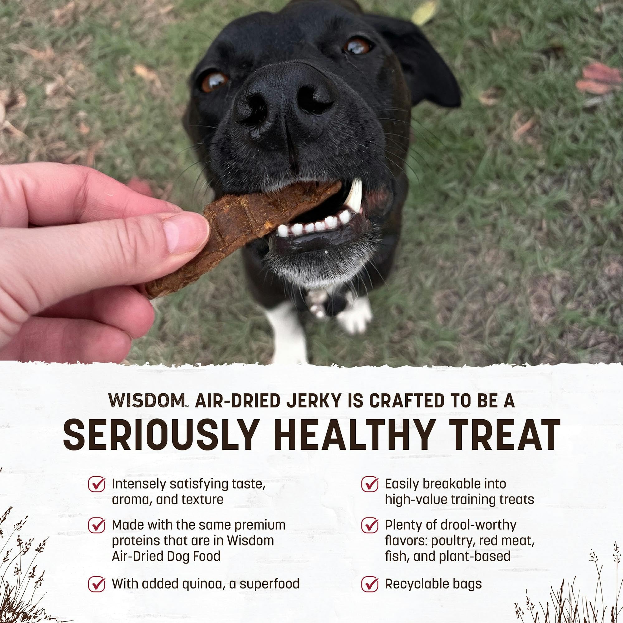Details: Since 1979, Earth Animal has been dedicated to helping pets live long, healthy lives by creating high-quality, wholesome foods, treats, herbal remedies, & supplements. As a holistic veterinary family, we share your goals of wellness and longevity for animals. We take making Wisdom Air-Dried Jerky as seriously as we do Wisdom Air-Dried Dog Food. Each flavor of our aromatic jerky is crafted in small batches at Riverstone, our manufacturing facility in the farmlands of Maryland, where we oversee the integrity of every ingredient from start to finish. You can trust that every choice we make thoughtfully upholds our mission to preserve and enhance quality of life for all Earth’s animals. We will always be transparent about how Wisdom is made, our compassionate sourcing, and our selection of ingredients. Earth Animal dedicates 1% of annual net sales to efforts that preserve and enhance quality of life for animals, people, and the Earth.