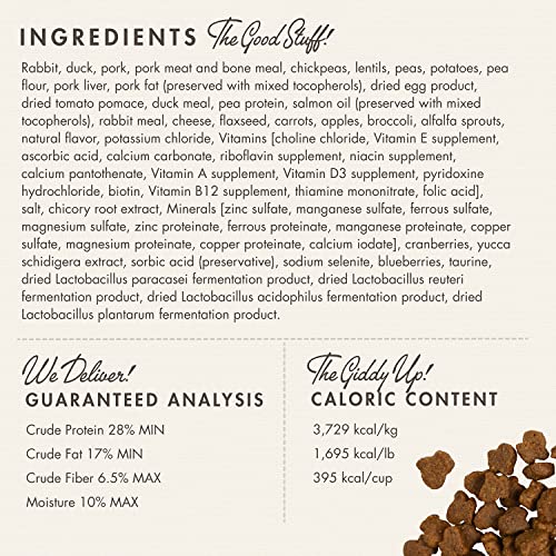 Details: Fromm Four-Star Hasen Duckenpfeffer is a savory grain-free recipe of rabbit and duck combined with hearty potatoes, carrots, and celery. INGREDIENTS: Rabbit, Duck, Pork Meat Meal, Peas, Potatoes, Lentils, Chickpeas, Pea Flour, Dried Tomato Pomace, Dried Whole Egg, Pork Fat, Rabbit Meal, Pork Liver, Pea Protein, Salmon Oil, Cheese, Flaxseed, Alfalfa Meal, Carrots, Celery, Lettuce, Watercress, Spinach, Potassium Chloride, Salt, Chicory Root Extract, Yucca Schidigera Extract, Sodium Selenite, Folic Acid, Taurine, Parsley, Sorbic Acid (Preservative), Vitamins, Minerals, Probiotics. 393 kcal per cup.
